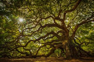 شجرة البلوط العتيقة للحياة: مظلة غارقة بأشعة الشمس – لوحة جدارية عصرية بدون إطار