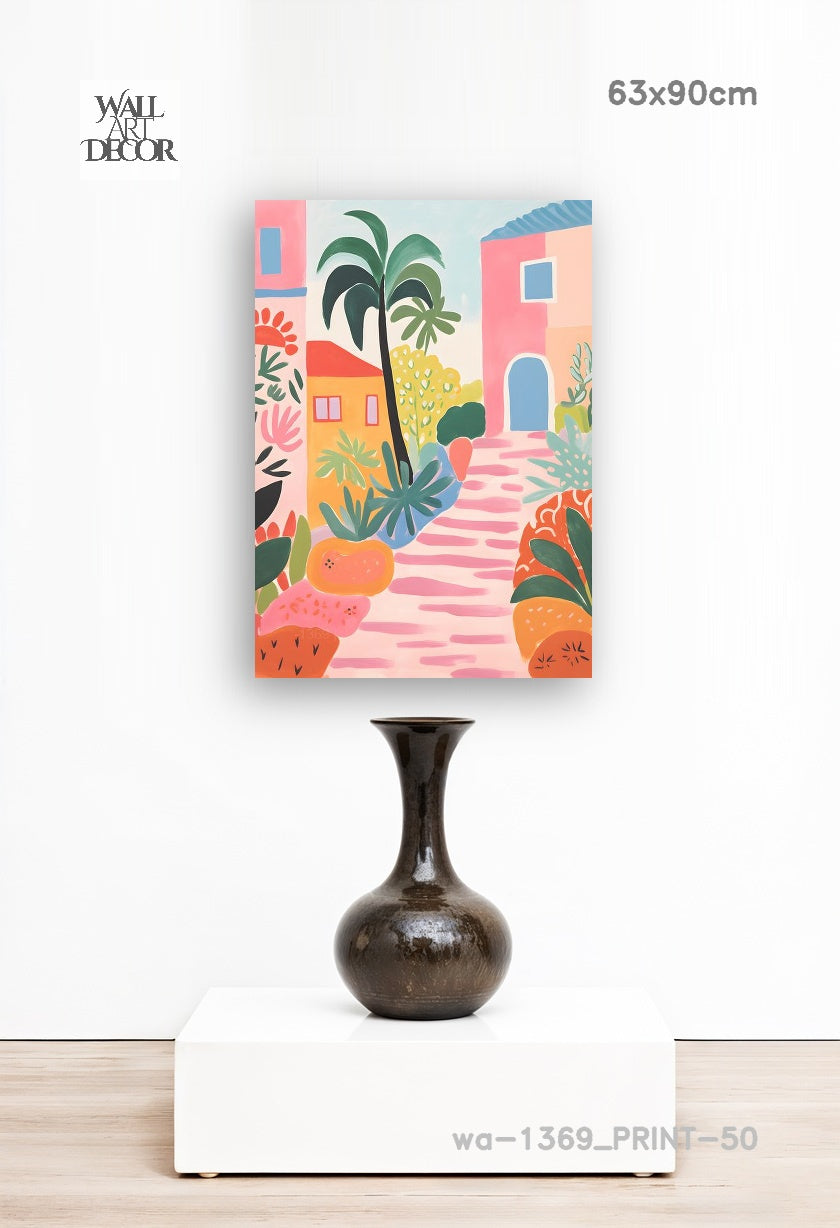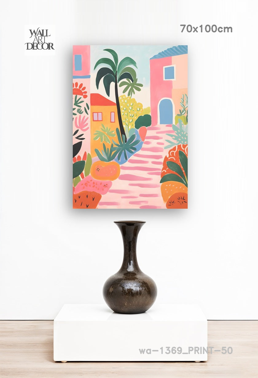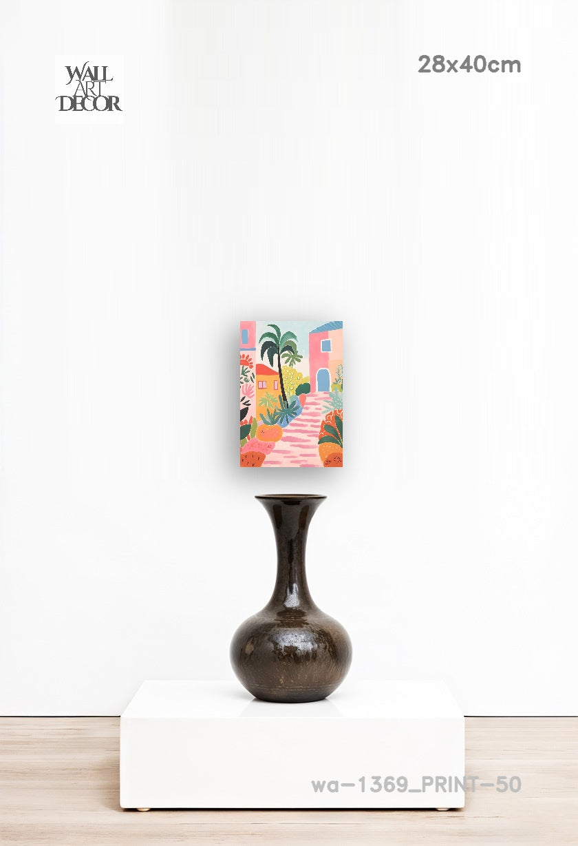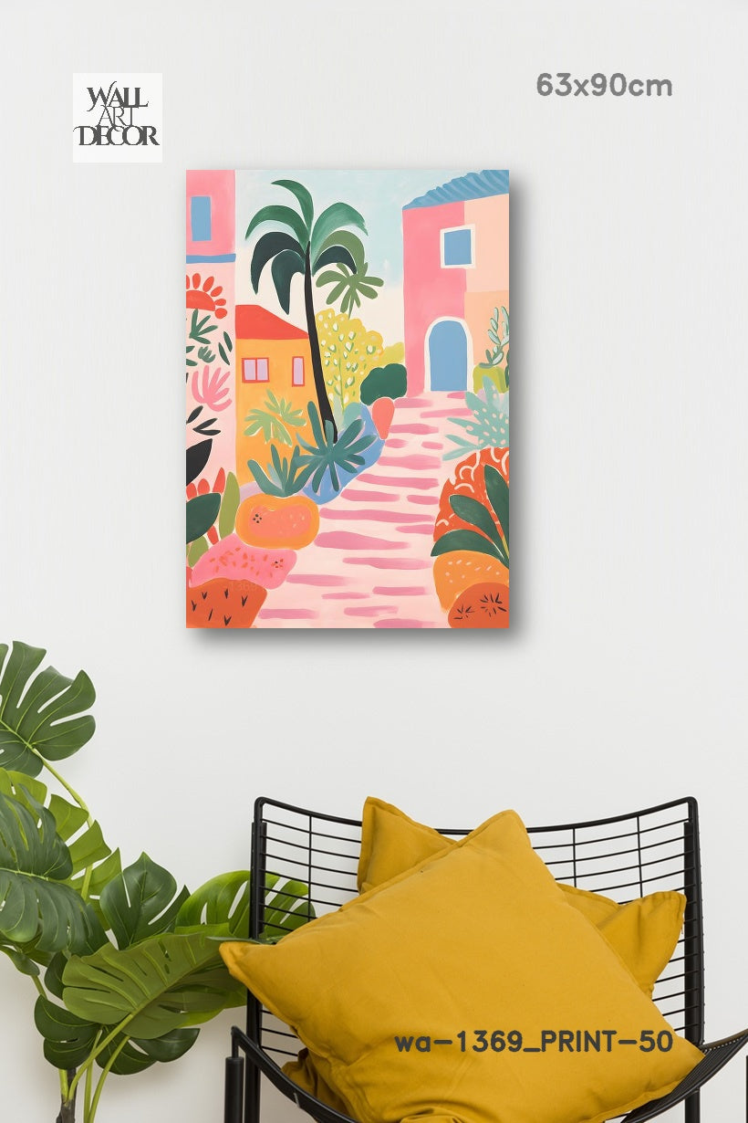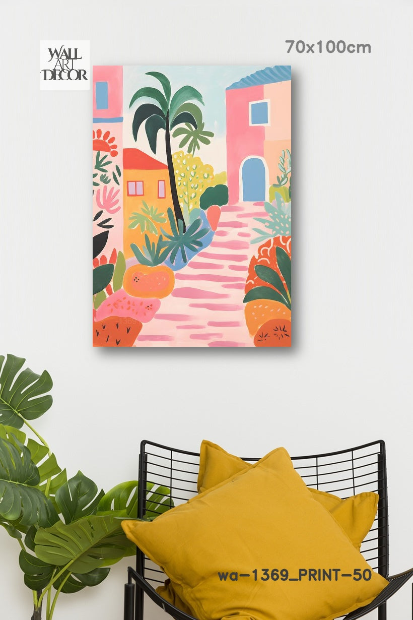 أضف إلى منزلك أجواءً مفعمة بالحيوية والإشراق مع لوحة "زقاق أزور". تجسد هذه اللوحة النابضة بالحياة مشهدًا ساحرًا من شوارع البحر الأبيض المتوسط، مُعاد تخيله من خلال عدسة فن البوب ​​الشعبي الحديث. تتميز اللوحة بأحجارها المرصوفة الوردية، ومبانيها ذات اللون الطيني الزاهي، وأشجار النخيل المتمايلة، لتُشكل احتفاءً بالحياة الساحلية والتصميم المرح. أما لوحة الألوان الجريئة، من الوردي الفاتح والبرتقالي المشمس والأخضر الاستوائي العميق، فتخلق جوًا ساحرًا يُشعرك وكأنك في عطلة صيفية دائمة.