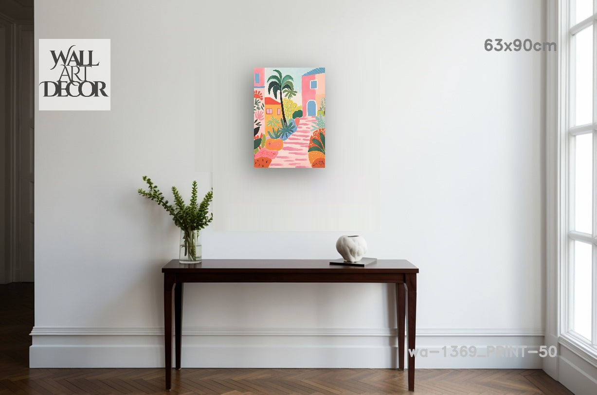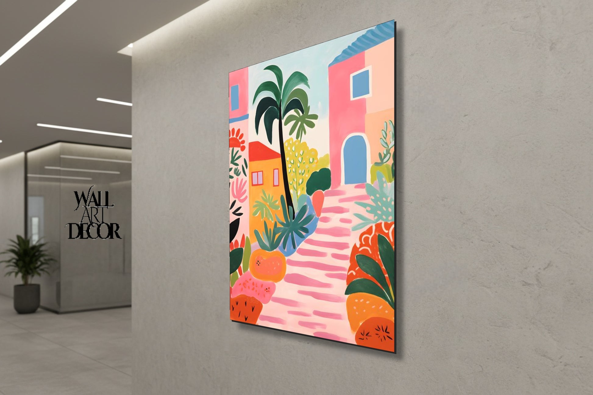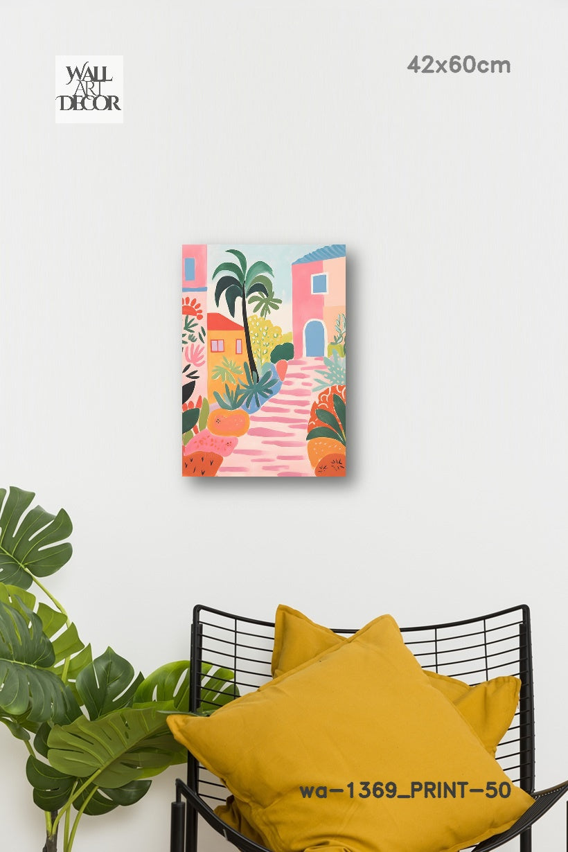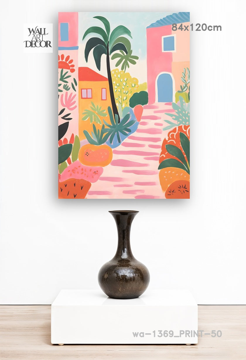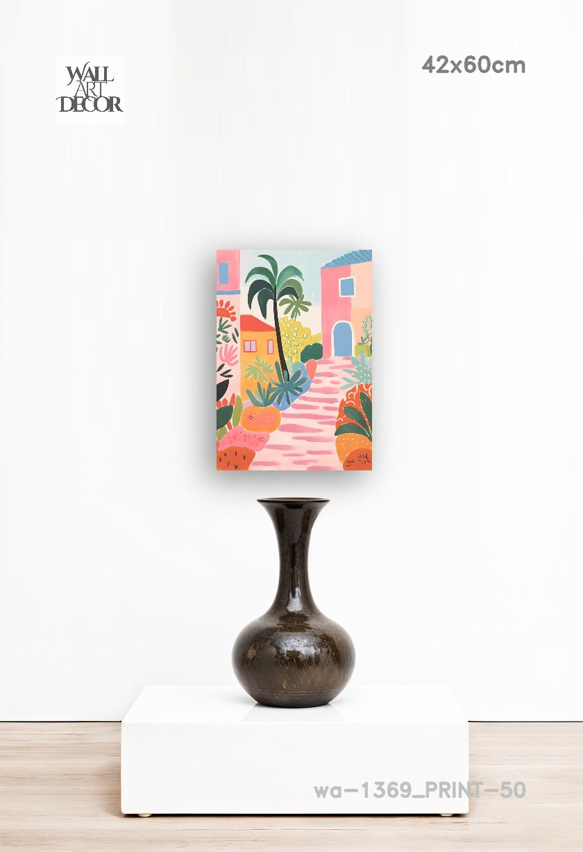 أضف إلى منزلك أجواءً مفعمة بالحيوية والإشراق مع لوحة "زقاق أزور". تجسد هذه اللوحة النابضة بالحياة مشهدًا ساحرًا من شوارع البحر الأبيض المتوسط، مُعاد تخيله من خلال عدسة فن البوب ​​الشعبي الحديث. تتميز اللوحة بأحجارها المرصوفة الوردية، ومبانيها ذات اللون الطيني الزاهي، وأشجار النخيل المتمايلة، لتُشكل احتفاءً بالحياة الساحلية والتصميم المرح. أما لوحة الألوان الجريئة، من الوردي الفاتح والبرتقالي المشمس والأخضر الاستوائي العميق، فتخلق جوًا ساحرًا يُشعرك وكأنك في عطلة صيفية دائمة.