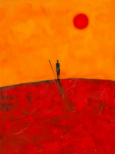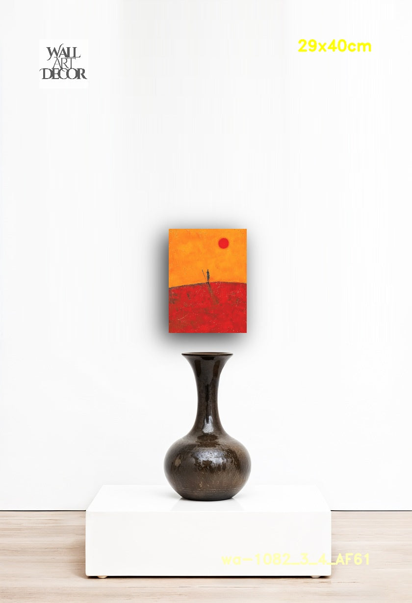 جسّد جمال الصحراء الخام والآسر مع لوحة "الأفق القرمزي". تُصوّر هذه اللوحة المعاصرة المذهلة مشهدًا لشخص وحيد يقف على قمة كثيب رملي شاسع بلون الدم، تحت سماء برتقالية زاهية تغمرها أشعة الشمس. تتدلى شمس قرمزية وحيدة في الأفق، مُلقيةً بظلالها الطويلة والخلابة. رُسمت هذه اللوحة بضربات فرشاة جريئة ذات ملمس كثيف، لتُوازن ببراعة بين التكوين البسيط والألوان القوية، مُستحضرةً إحساسًا عميقًا بالعزلة وجلال الطبيعة الخالد.