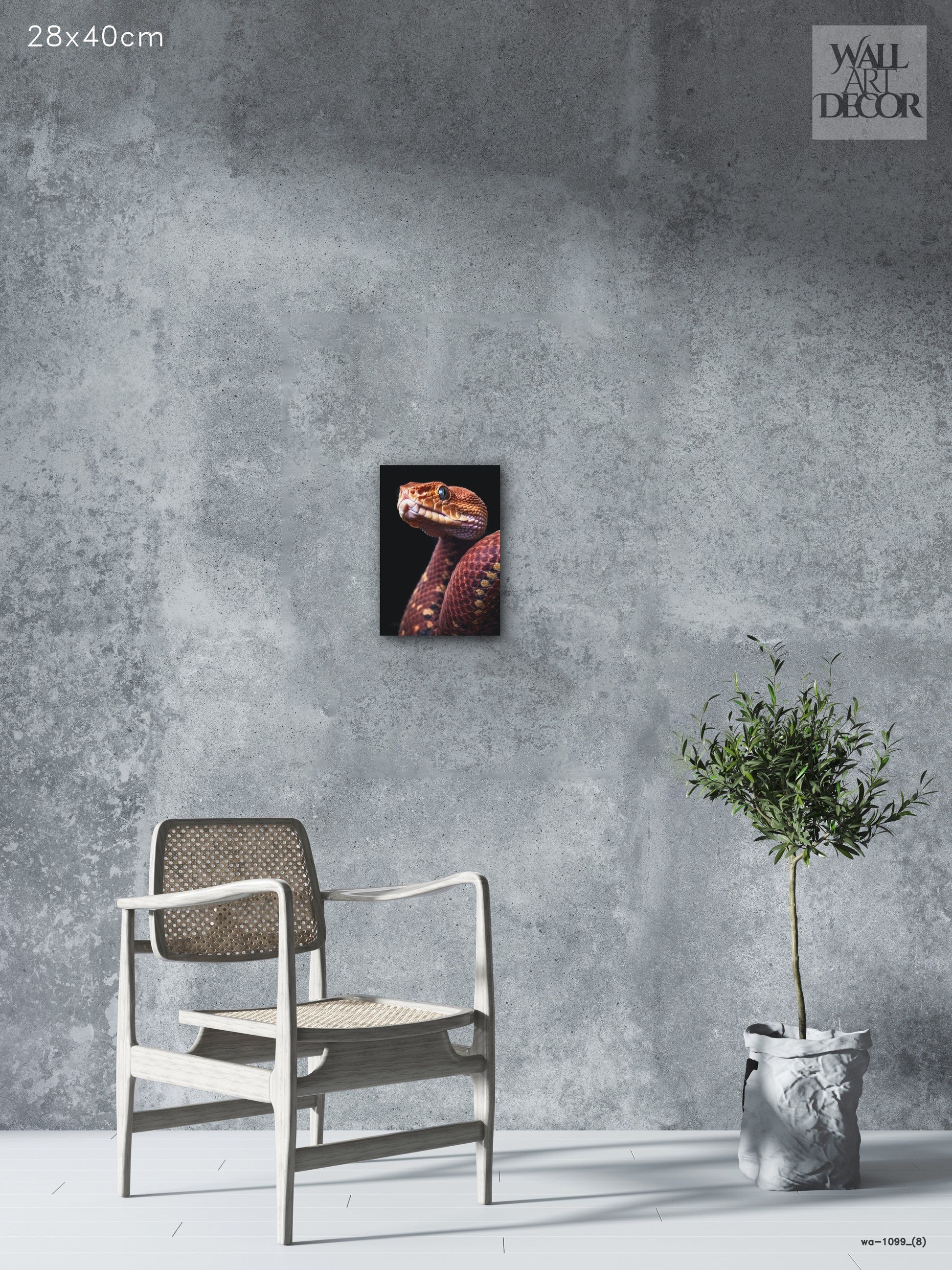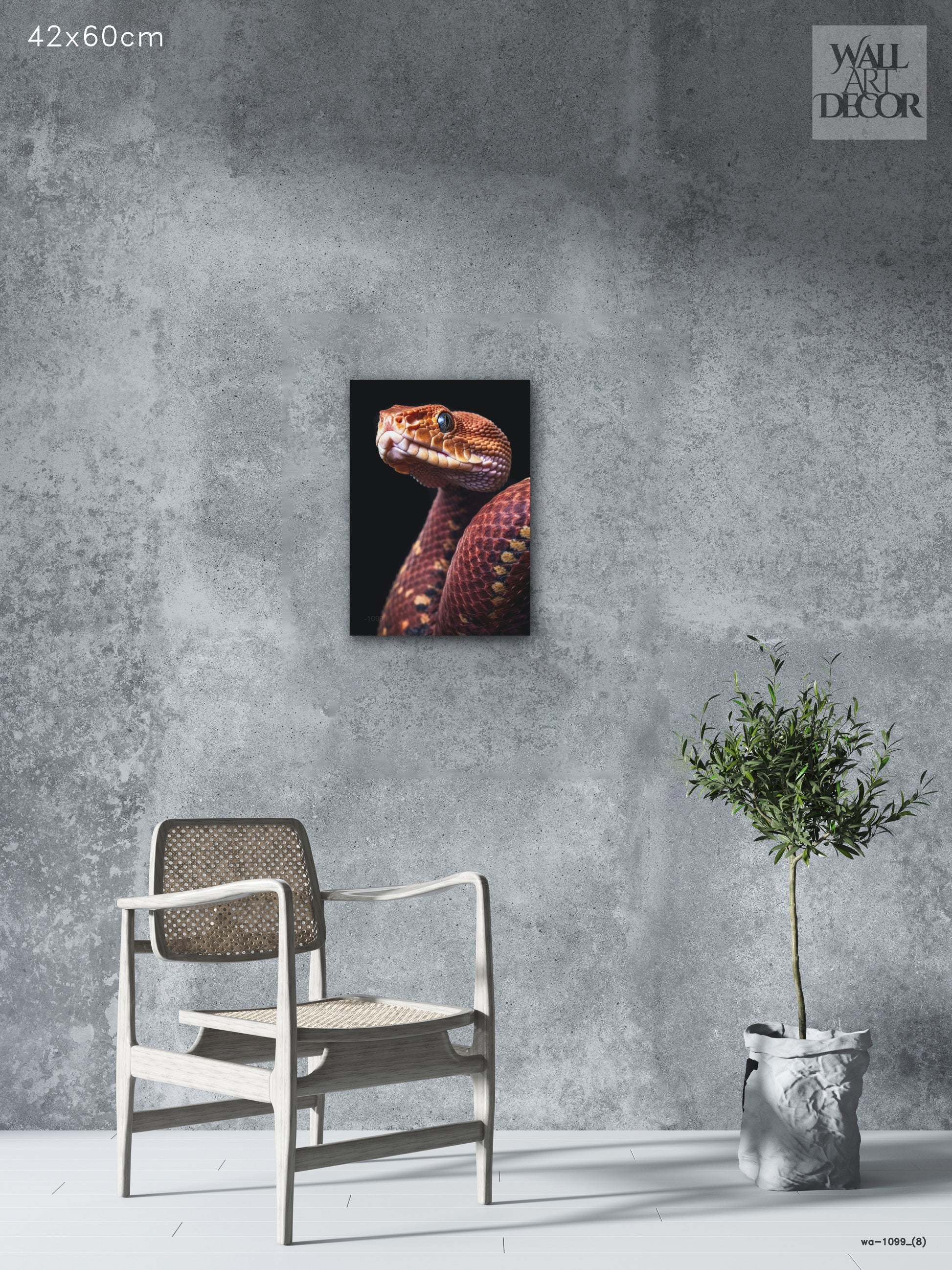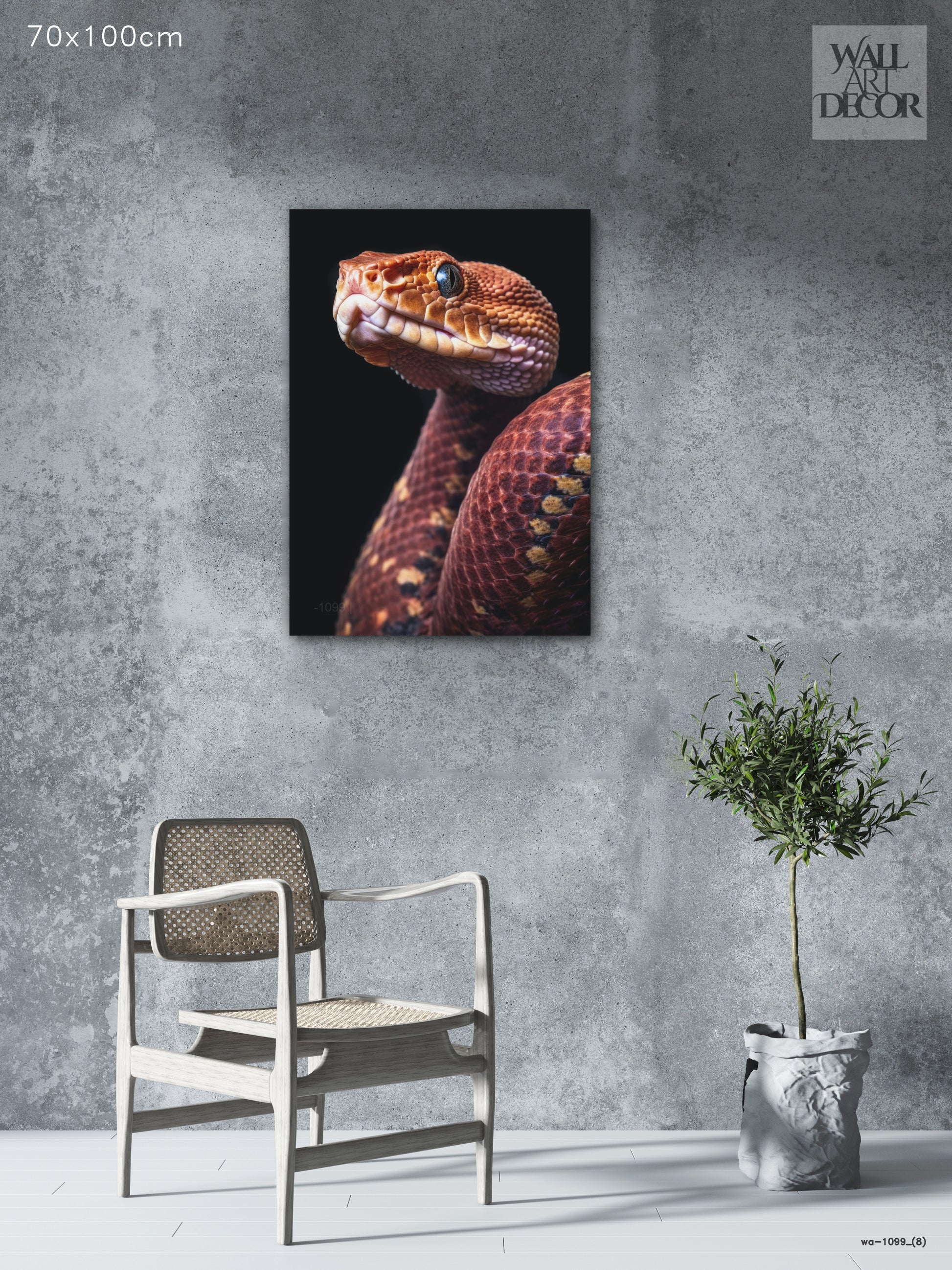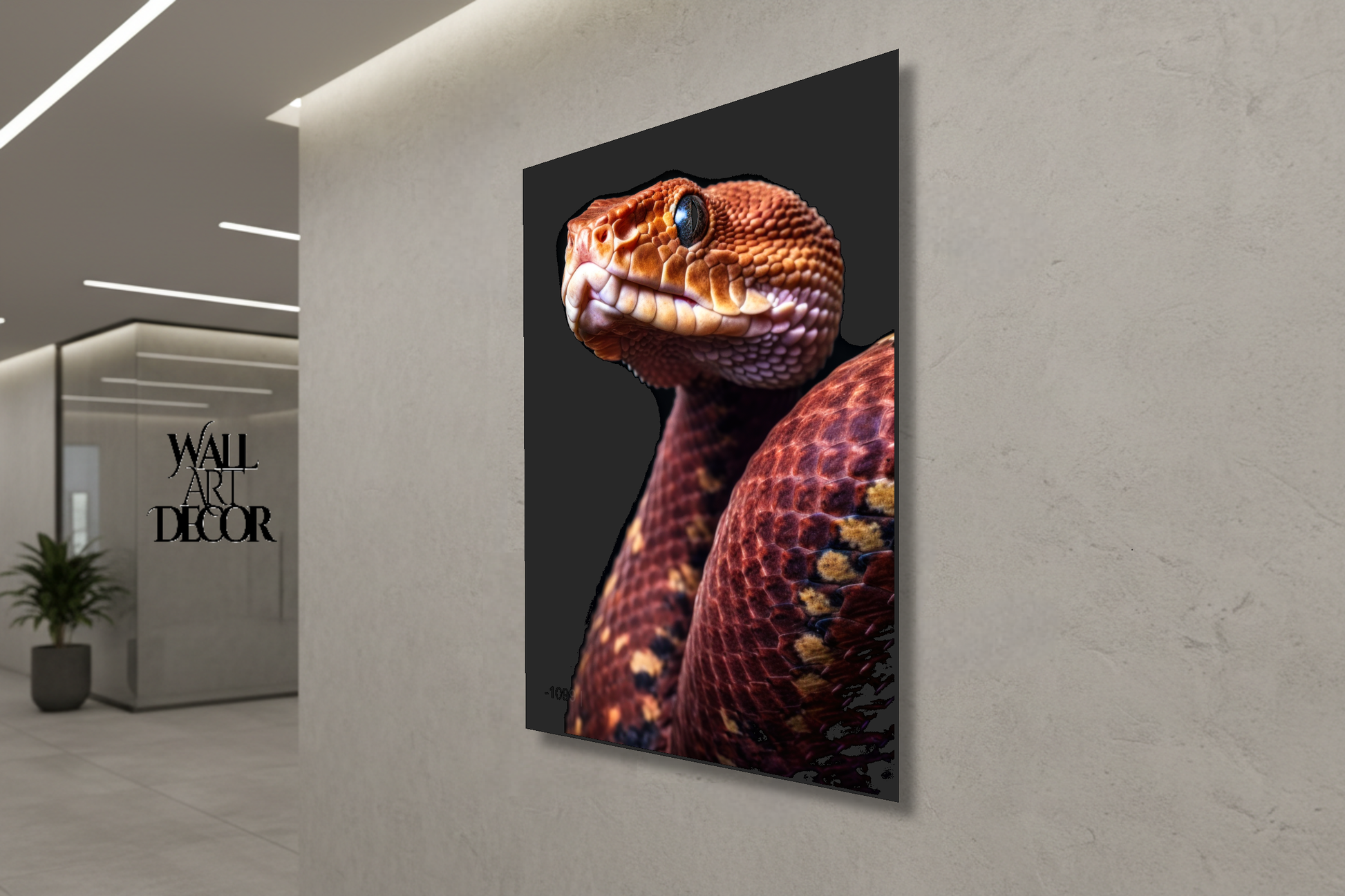 أضف لمسة جمالية آسرة إلى مساحتك مع لوحة "الحراشف القرمزية" المذهلة والفريدة. تُجسّد هذه الصورة فائقة الوضوح ثعبانًا بتفاصيل دقيقة تخطف الأنفاس، مُركّزةً على الهندسة المعقدة لحراشفه النحاسية والبرتقالية المحروقة. يُبرز التباين الحاد مع الخلفية السوداء الداكنة هيبة المخلوق وعمق عينيه الكريستالي.