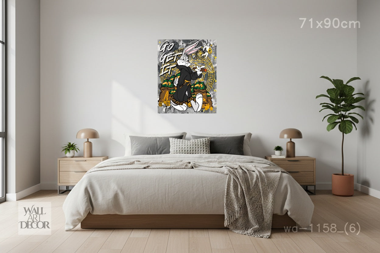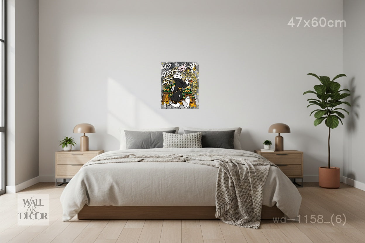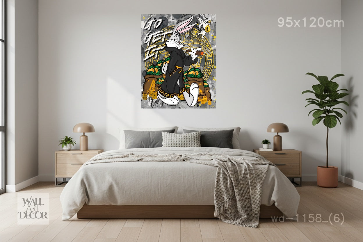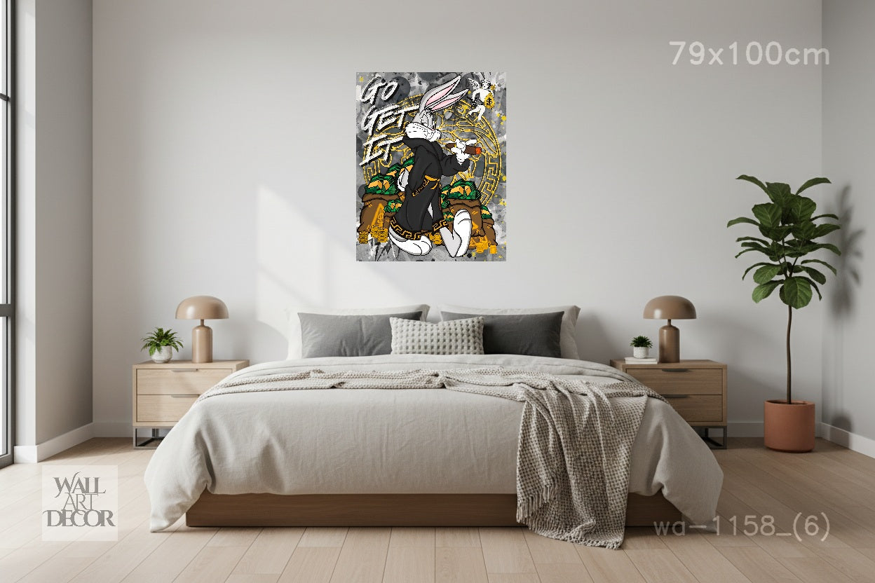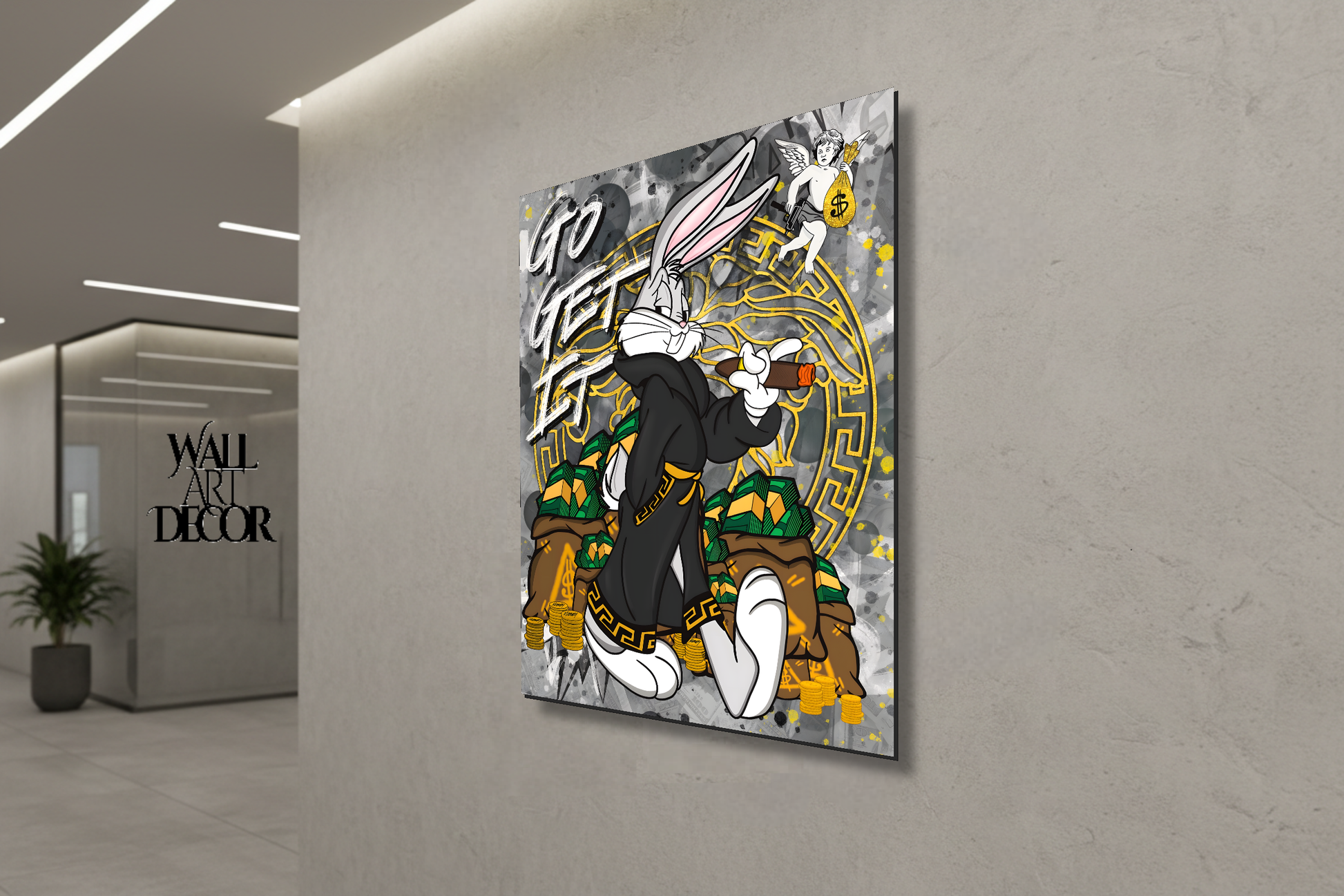 أضف لمسة جريئة وطموحة إلى جدرانك مع لوحة "انطلق واحصل عليها". تتميز هذه اللوحة الفنية الحضرية النابضة بالحياة بصورة الأرنب الأشهر في العالم مرتدياً رداءً فاخراً باللونين الأسود والذهبي، رمزاً لفن الشارع الذي يحتفي بالثروة والنجاح. تحيط باللوحة أكياس من النقود والعملات الذهبية وملاك صغير يحمل كيساً من المال، وترتكز على ميدالية ذهبية مميزة وخلفيات من رسومات الغرافيتي الجريئة.