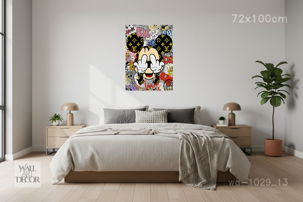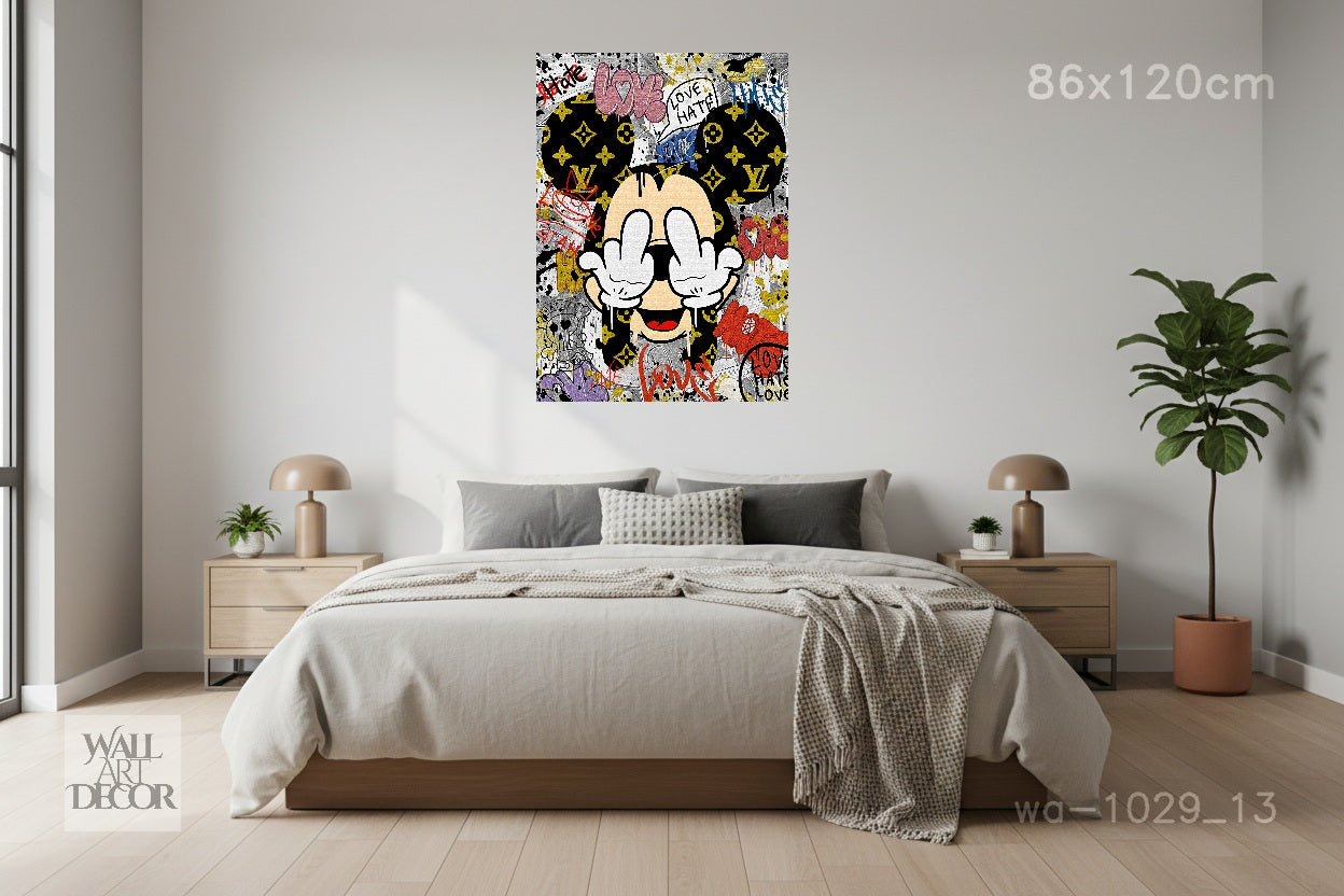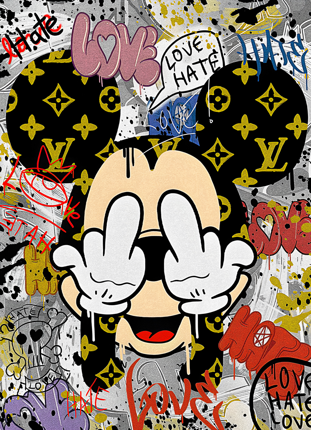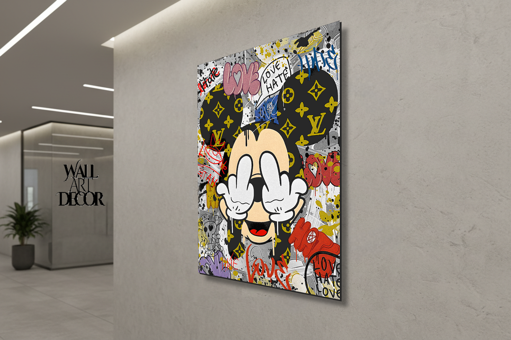 أضف لمسةً مميزةً إلى ديكور منزلك مع لوحة "تمرد ميكي"، وهي مزيجٌ نابضٌ بالحياة يجمع بين سحر الرسوم المتحركة الكلاسيكية وروح ثقافة الشارع المعاصرة. تتميز هذه اللوحة النابضة بالحياة بصورة ميكي ماوس في وضعيةٍ جريئةٍ ومفعمةٍ بالتحدي، حيثُ تم تحويل صورته الظلية بنمطٍ ذهبيٍّ فاخرٍ وجريء. تُشكّل اللوحة مزيجًا متداخلًا من عبارات "حب/كراهية" المكتوبة على الجدران، وتأثيرات الطلاء المتساقط، ولمساتٍ من عالم الموضة الراقية، كل ذلك على خلفيةٍ حضريةٍ أحادية اللون ذات ملمسٍ مميز.