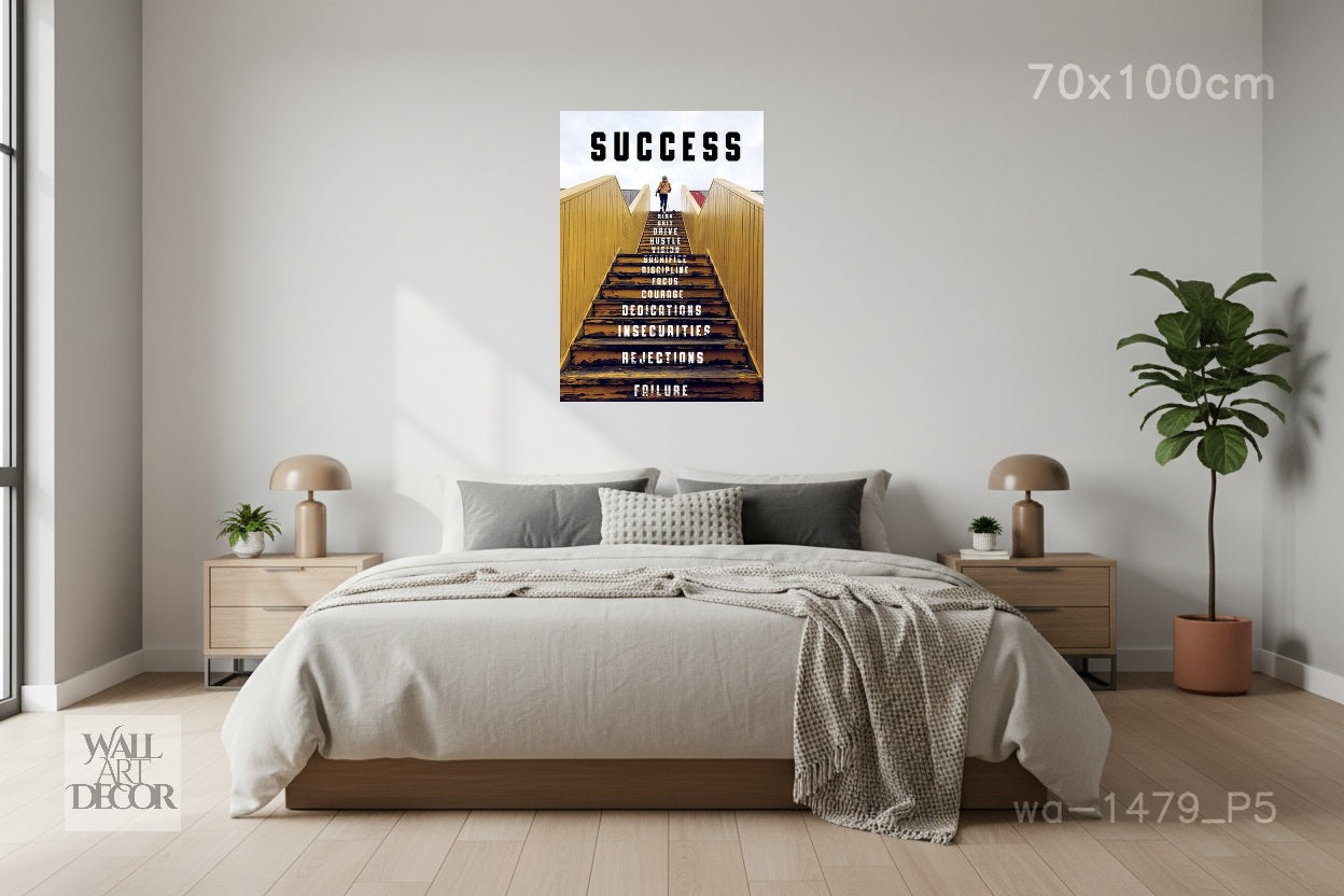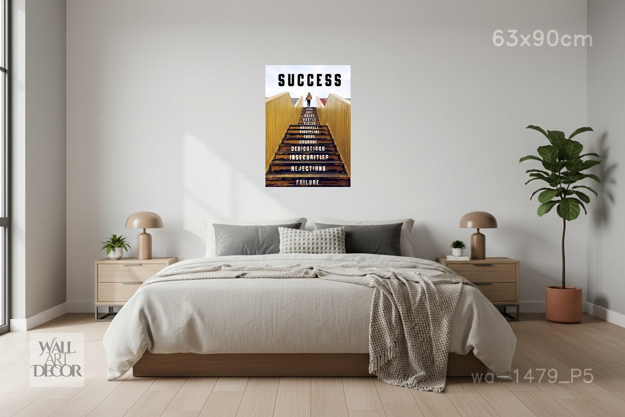 تخيّل رحلة الإنجاز الحقيقية مع لوحة "الصعود". تستخدم هذه اللوحة التحفيزية المؤثرة استعارة معمارية قوية لتوضيح أن "النجاح" هو الوجهة النهائية لتسلق طويل وشاق. يُرى شخص وحيد يصل إلى قمة درج خشبي مضاء بنور الشمس، بينما تكشف كل درجة أسفله عن الأسس الخفية للعظمة. من قاعدة الفشل والرفض ، يرتفع المسار عبر الانضباط والشجاعة والتضحية ، ليبلغ ذروته في النهاية بالهدف الأسمى.