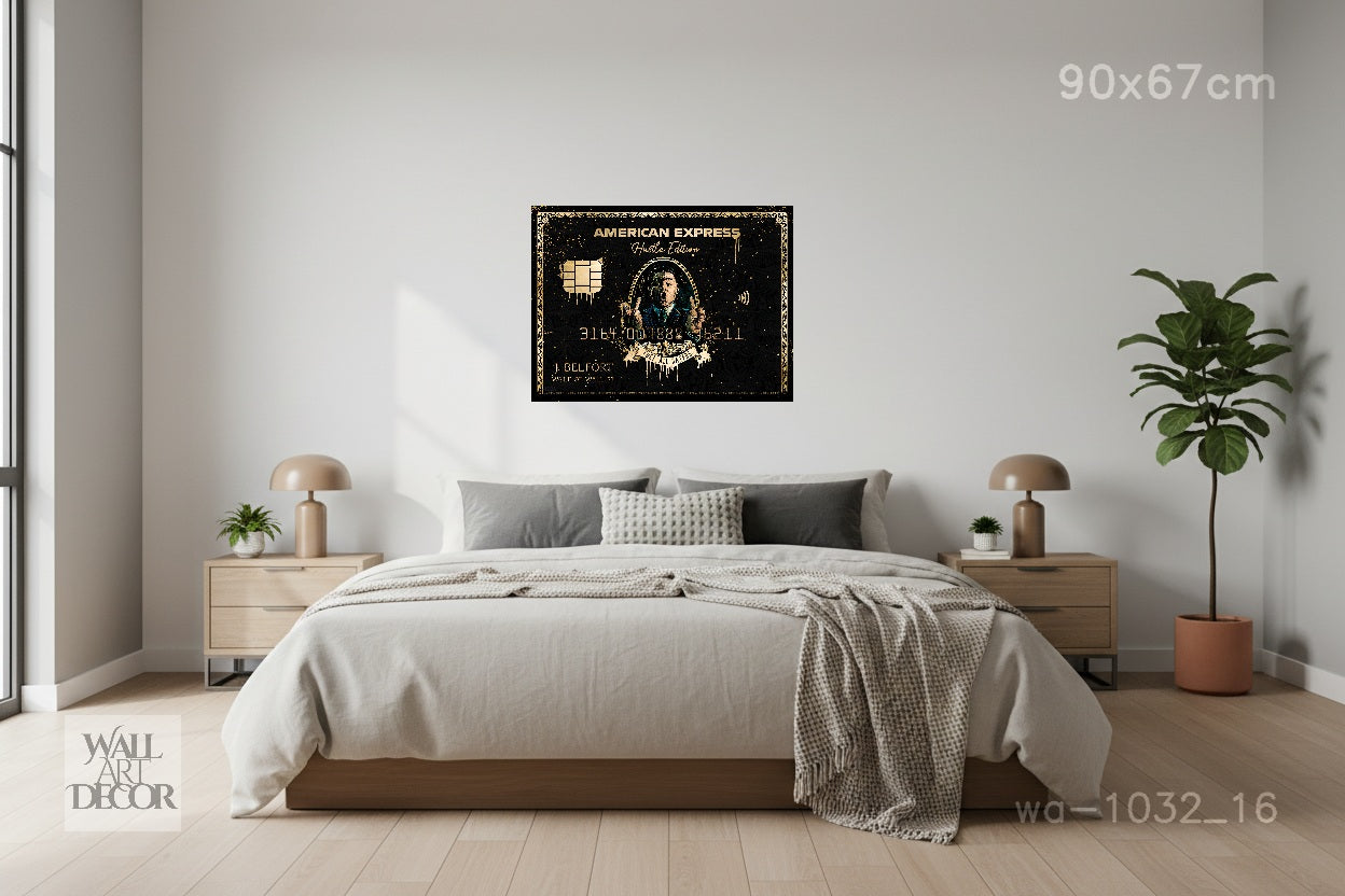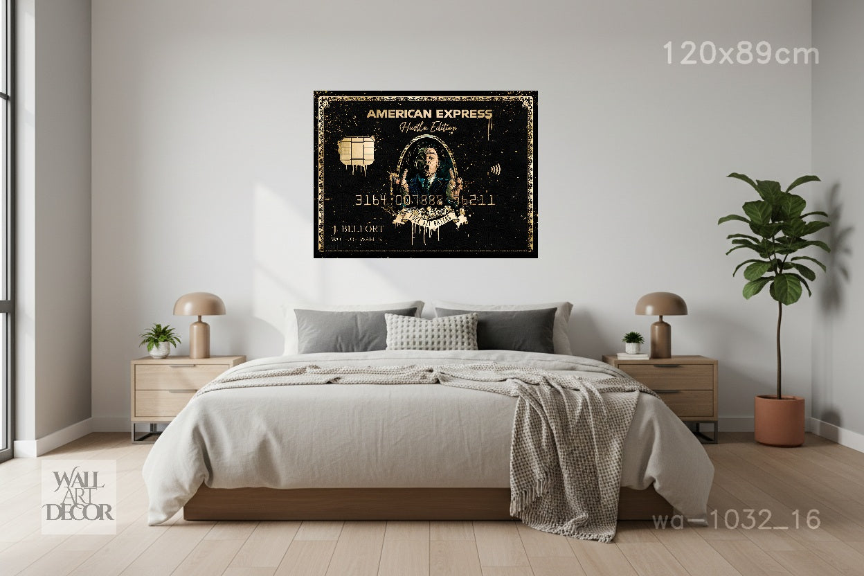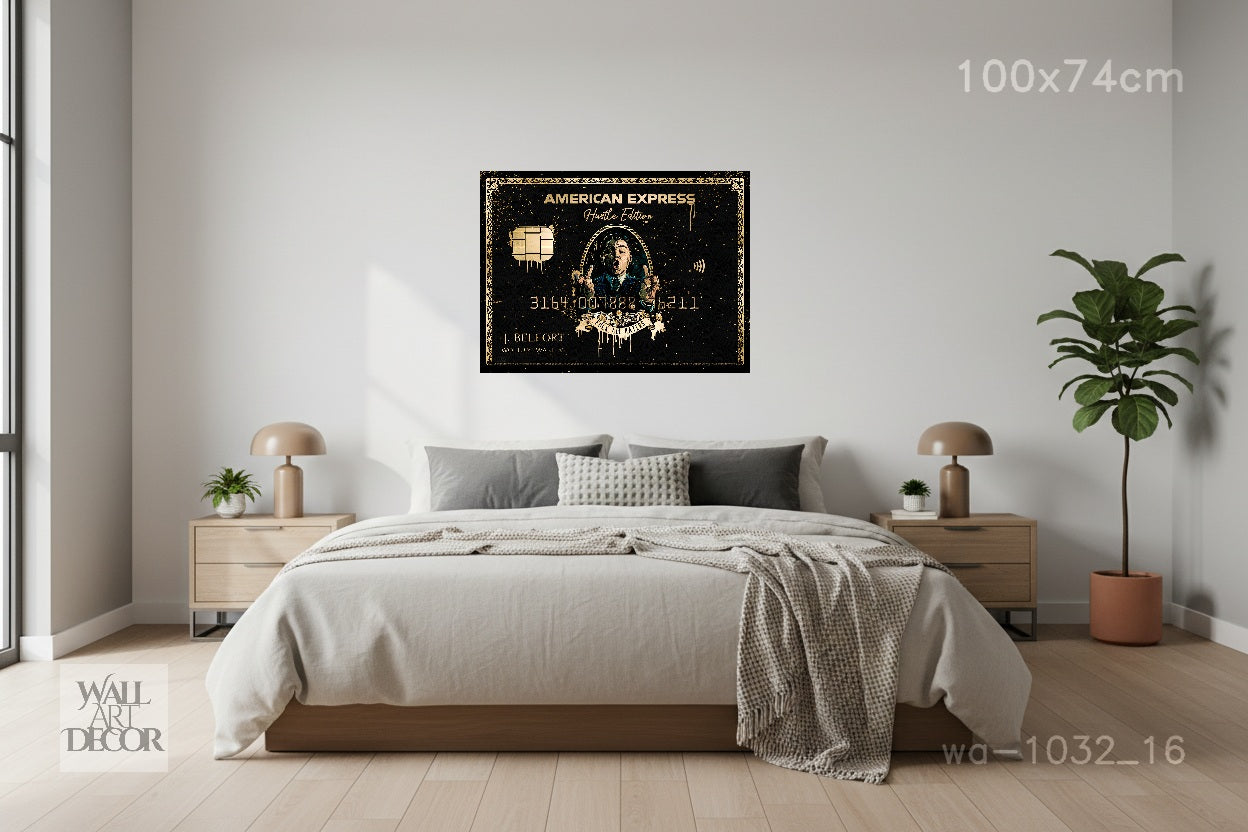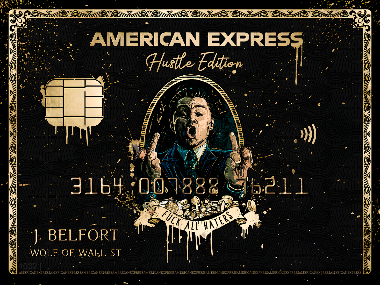 استلهم الطاقة المتدفقة لعالم المال مع "بطاقة بيلفورت السوداء". تُعيد هذه القطعة الفنية الحديثة الجريئة تخيّل رمز المكانة الأسمى - بطاقة أمريكان إكسبريس سنتوريون - كتحية لـ"ذئب وول ستريت". يظهر جوردان بيلفورت في وضعية تحدٍّ وحيوية، ويتميز التصميم بتفاصيل فاخرة، بما في ذلك بقع من الحبر الذهبي، وشعار "إصدار هاسل" مكتوب بخط خاص، وشعار "تباً لكل الكارهين".