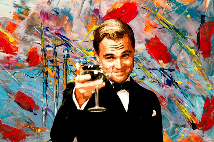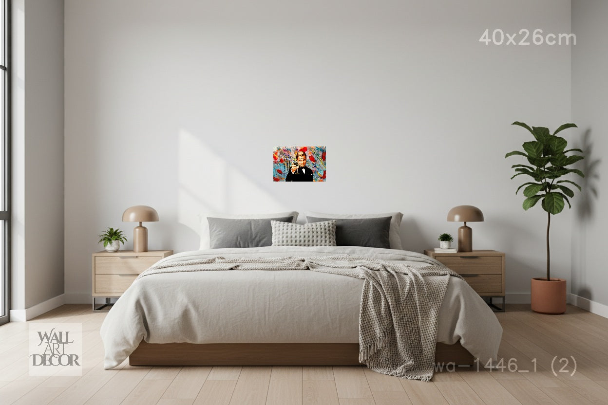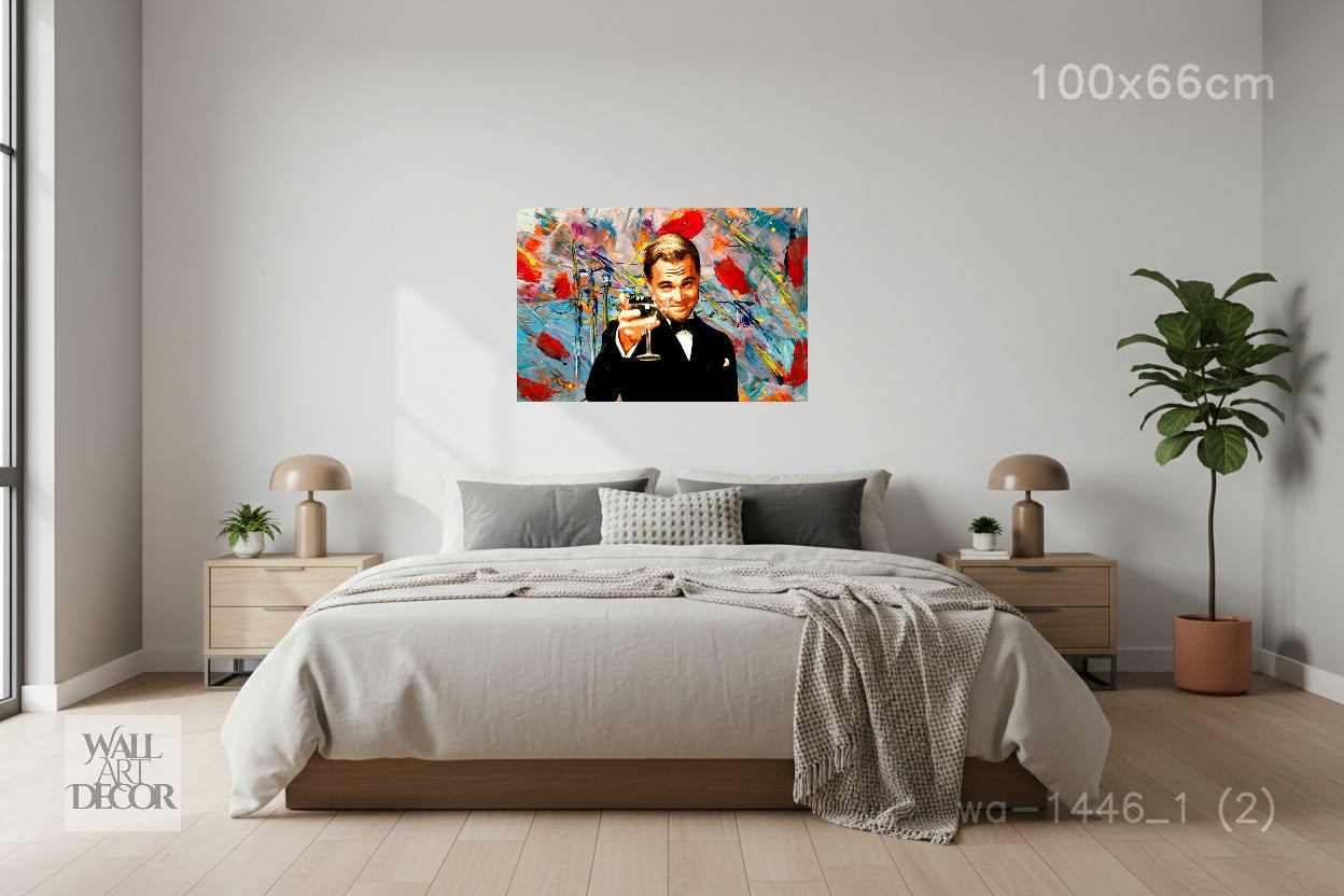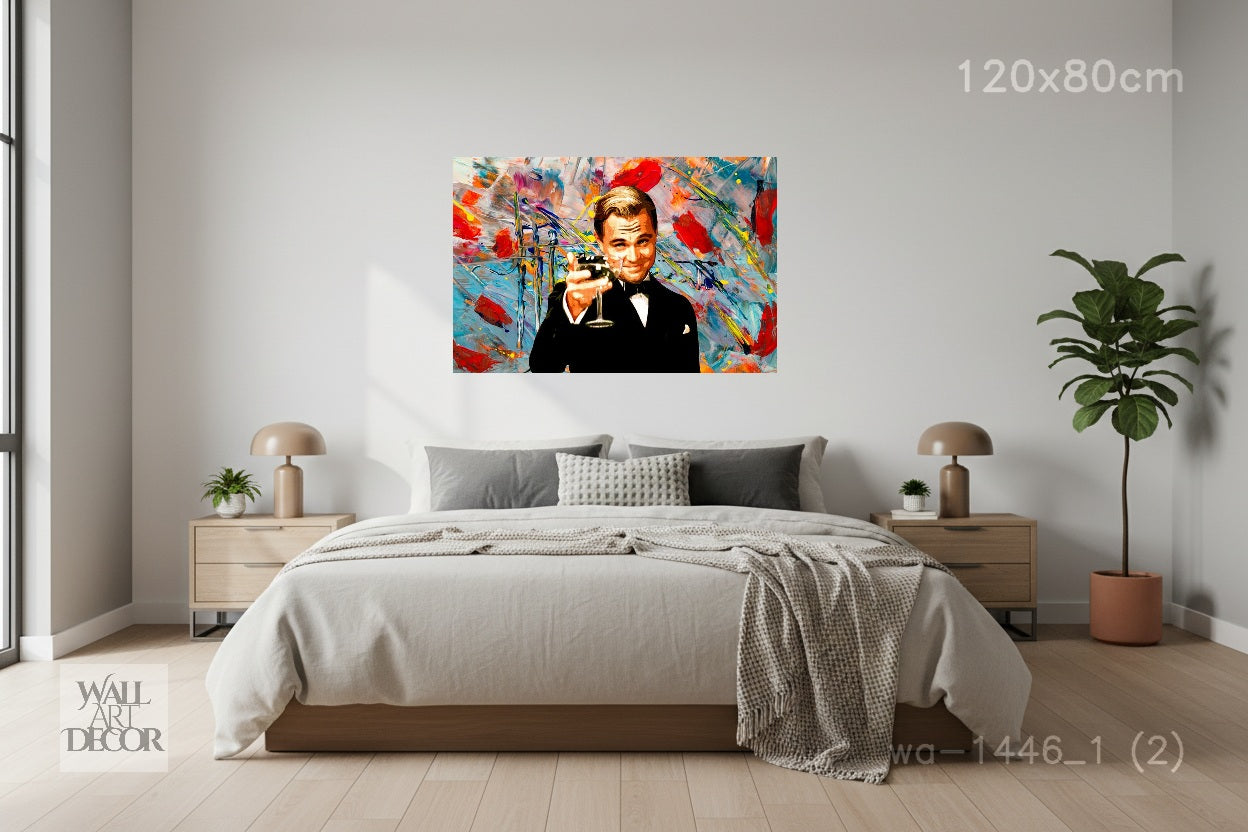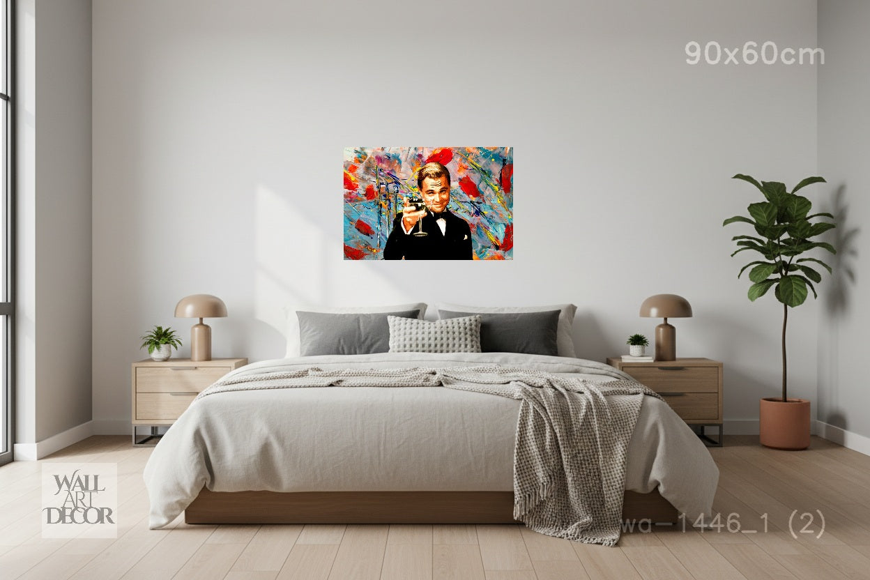 استمتع بروح الاحتفال الأسمى مع لوحة "الاحتفال الكبير". تُجسّد هذه اللوحة الفنية السينمائية المفعمة بالحيوية صورةً أنيقةً لأحد أشهر رجال هوليوود وهو يرفع كأسًا في نخبٍ كلاسيكي. وعلى خلفيةٍ نابضةٍ بالحياة، ذات طابعٍ تعبيري تجريدي، تتخللها ألوانٌ متناثرةٌ من الأزرق المخضر والأحمر الناري والأصفر الذهبي، تُوازن اللوحة بين الخطوط الحادة والدقيقة لبدلة التوكسيدو والجمال الخام والفوضوي لفن الشارع الحديث.