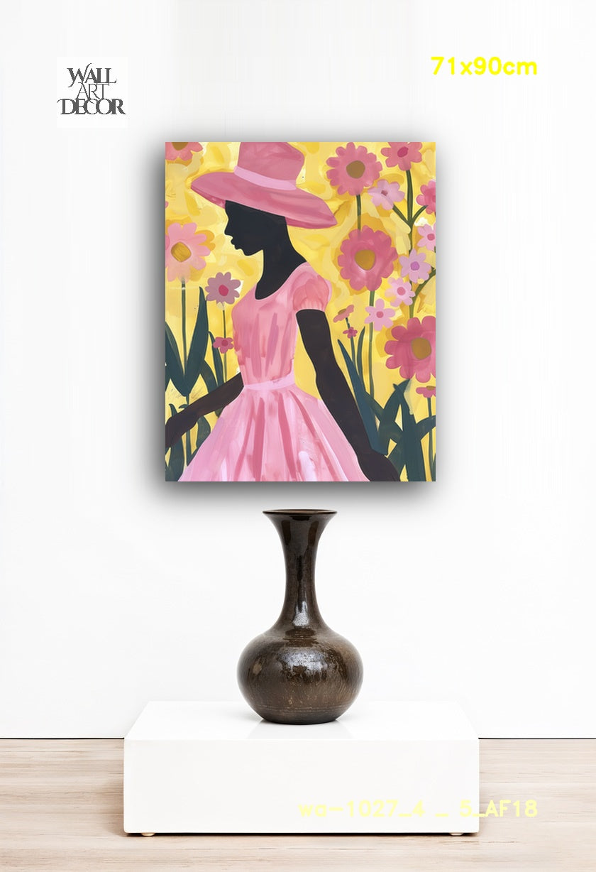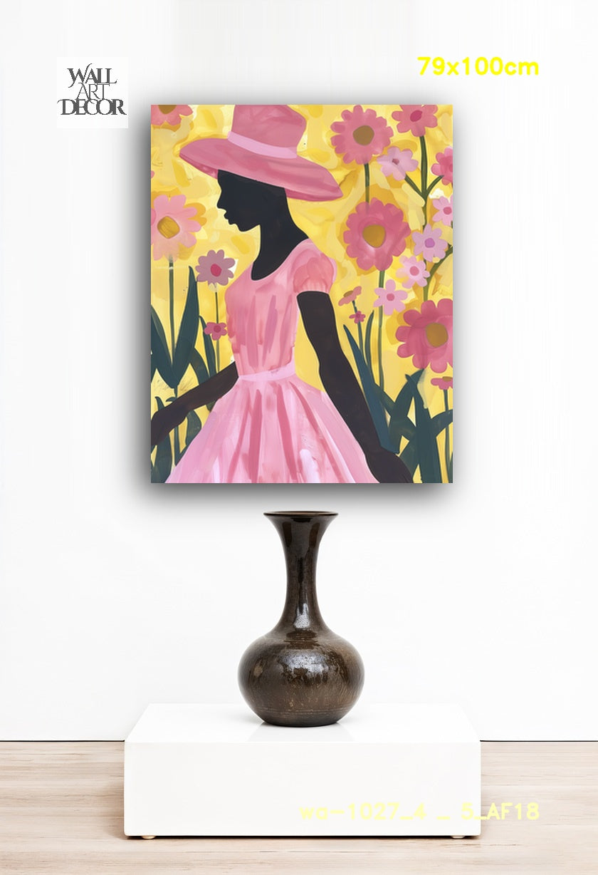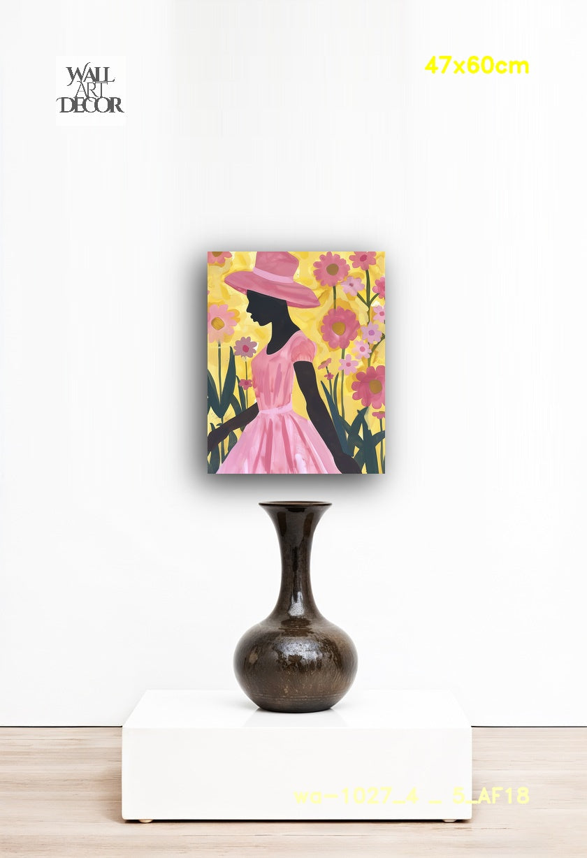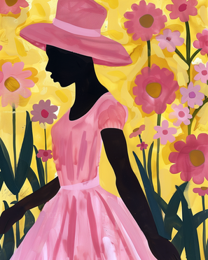 أضف لمسة من السحر والجمال الأنثوي إلى جدرانك مع لوحة "Tropical Blush". تتميز هذه اللوحة الرقمية المعاصرة الرائعة بصورة ظلية سوداء لافتة لامرأة ترتدي قبعة شمسية كلاسيكية واسعة الحواف وفستانًا فضفاضًا بأكمام منتفخة. تظهر المرأة في الصورة من الجانب، وهي تمشي برشاقة عبر حديقة واسعة من أزهار الأقحوان الوردية والبنفسجية المتفتحة. وعلى خلفية صفراء مشرقة مضاءة بأشعة الشمس، يحتفي هذا العمل الفني عالي التباين بالتناغم بين الجسد البشري وجمال الطبيعة.