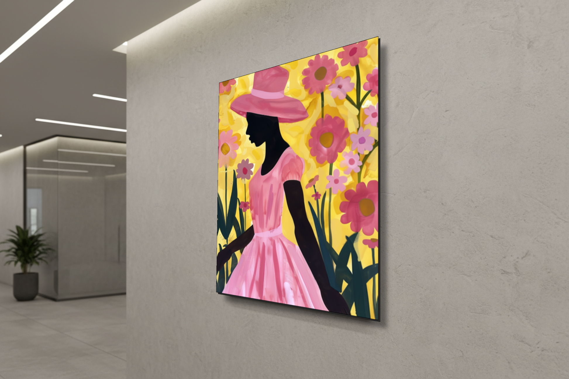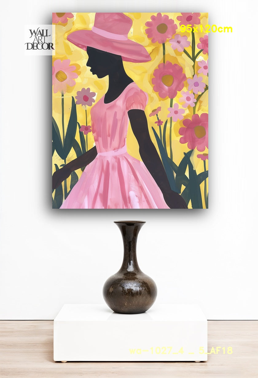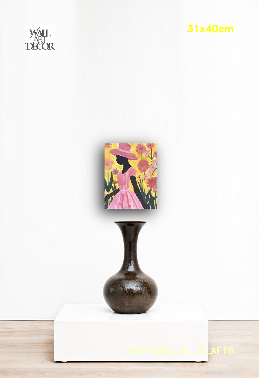 أضف لمسة من السحر والجمال الأنثوي إلى جدرانك مع لوحة "Tropical Blush". تتميز هذه اللوحة الرقمية المعاصرة الرائعة بصورة ظلية سوداء لافتة لامرأة ترتدي قبعة شمسية كلاسيكية واسعة الحواف وفستانًا فضفاضًا بأكمام منتفخة. تظهر المرأة في الصورة من الجانب، وهي تمشي برشاقة عبر حديقة واسعة من أزهار الأقحوان الوردية والبنفسجية المتفتحة. وعلى خلفية صفراء مشرقة مضاءة بأشعة الشمس، يحتفي هذا العمل الفني عالي التباين بالتناغم بين الجسد البشري وجمال الطبيعة.